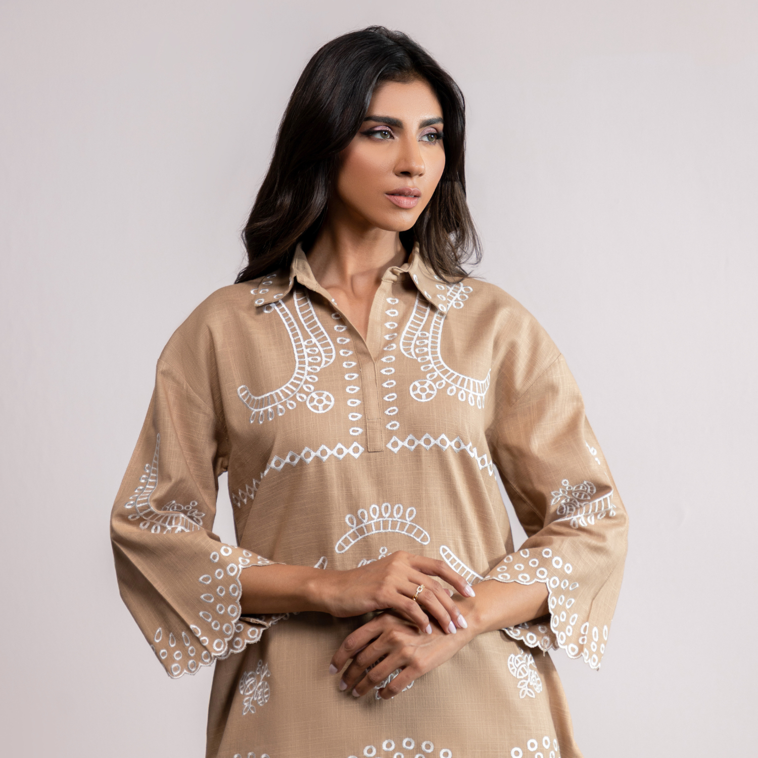 EMBROIDERED COTTON NET SHIRT - LIGHT GREY